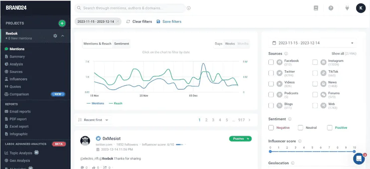 As you can see, besides the list of mentions, the dashboard includes advanced filters to sort the data and charts presenting mentions, reach, and sentiment. All those features provide quick access to the most important data.