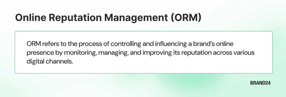 ORM (Online Reputation Management) refers to controlling and influencing a brand’s online presence by monitoring, managing, and improving its reputation across various digital channels.
