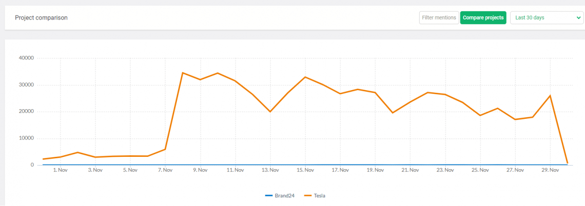 Brand24 offers an additional, Competitors tab, where you can compare two or more projects to see how your company is performing against other companies in your niche.